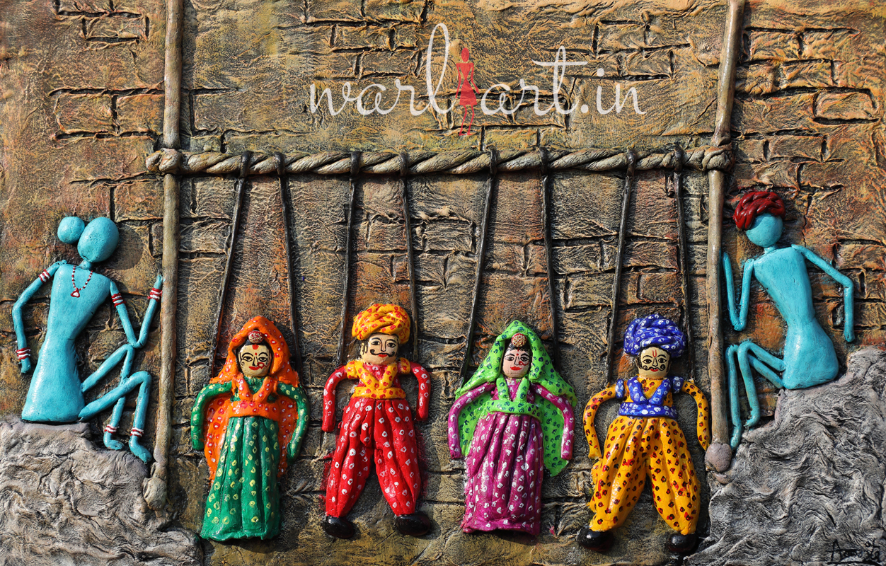 Street side puppet shop by walri couple. The mural shows traditional Rajasthani puppets being sold by warli villagers.